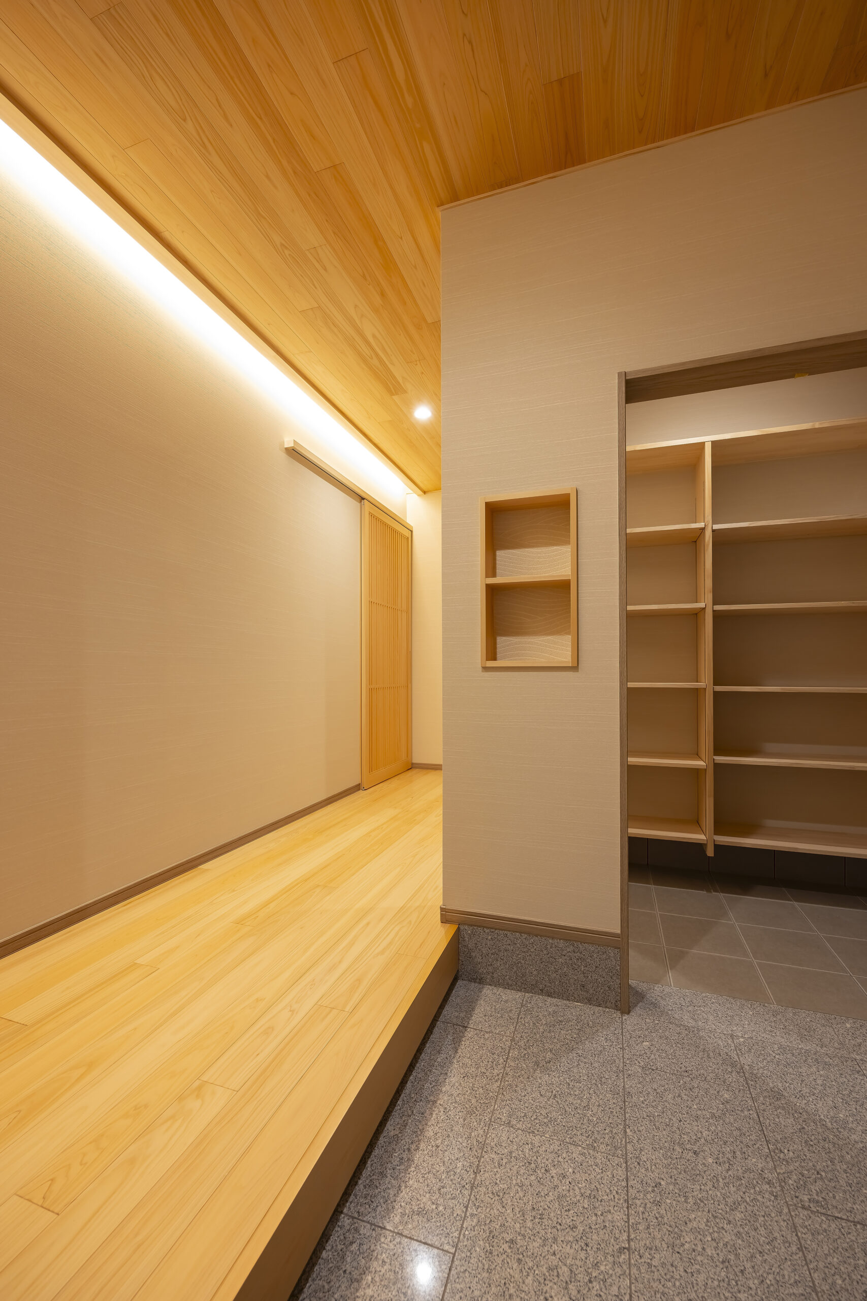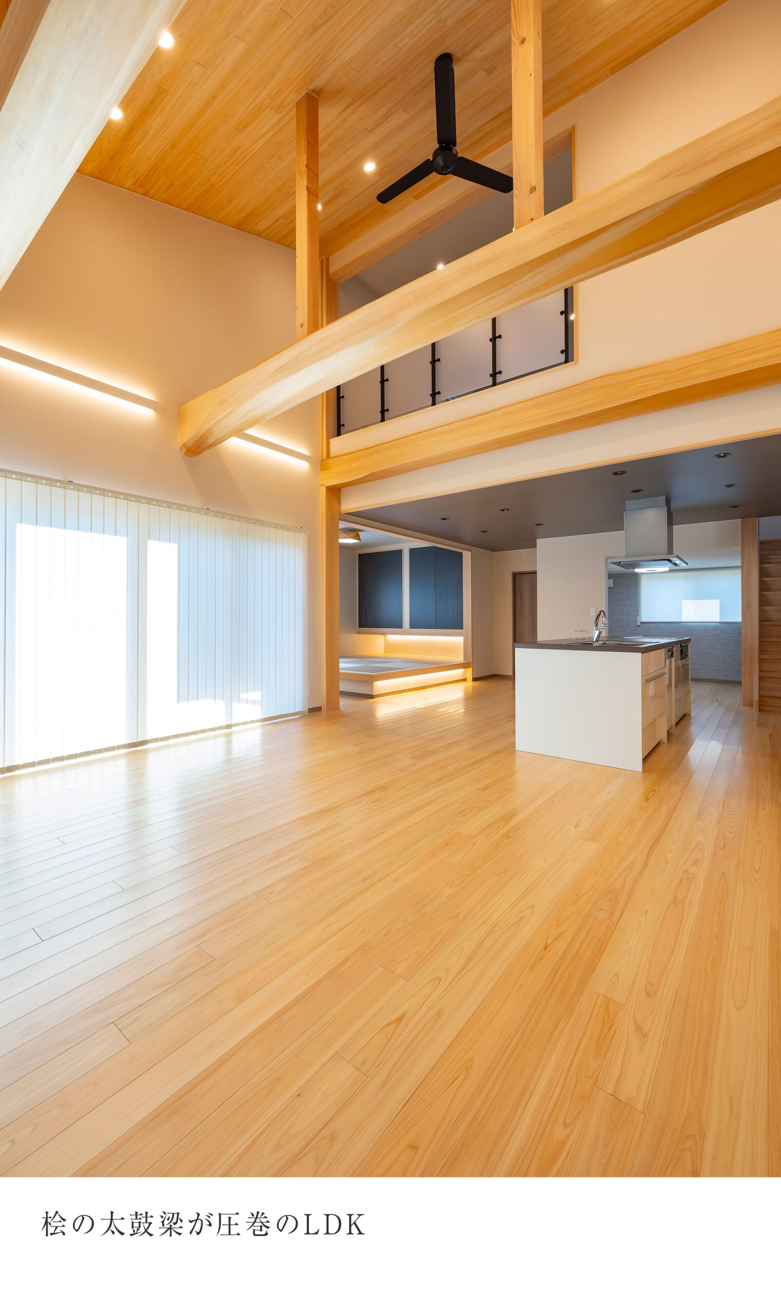 来客をもてなす大空間の吹き抜け、趣のある和モダンの家